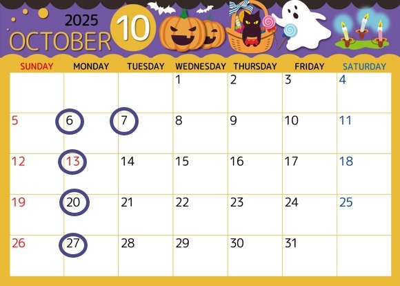 今回はハロウィンをモチーフにしたカレンダーで皆さんに10月定休日をご案内します!