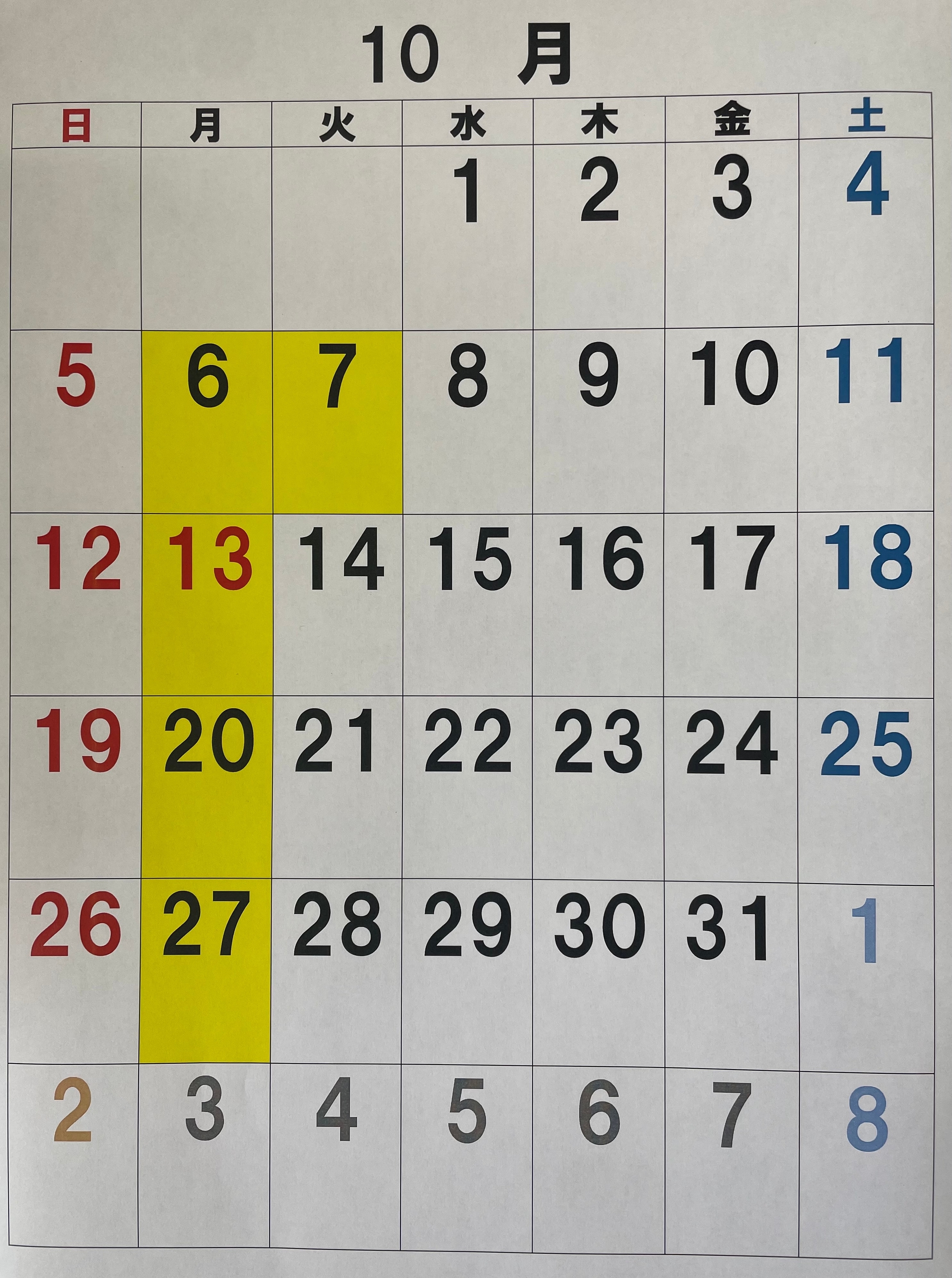 黄色く塗られた、6日・7日・13日・20日・27日が