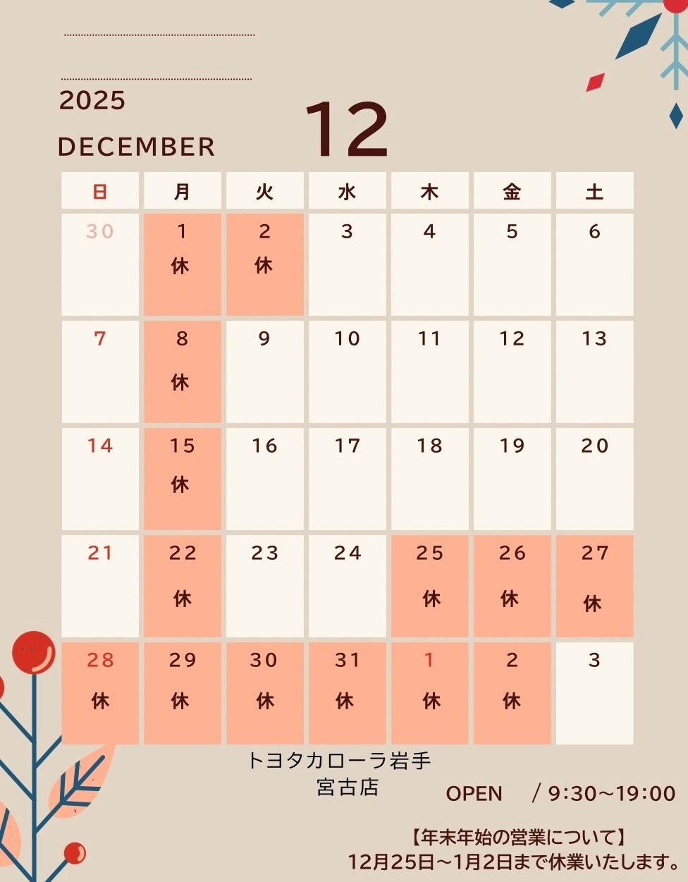 🎄12月の定休日と年末年始の営業日のお知らせ🎄