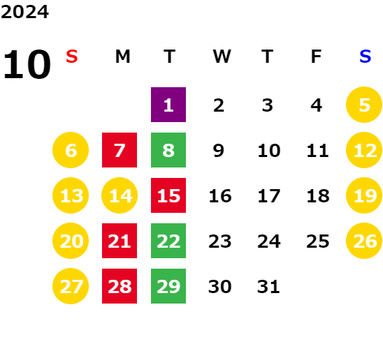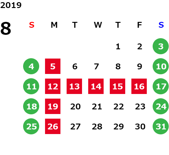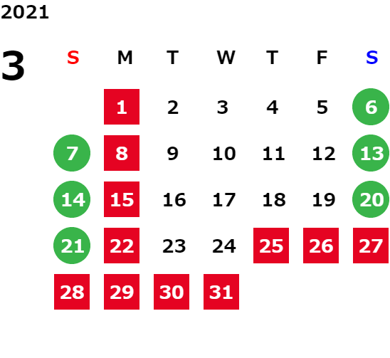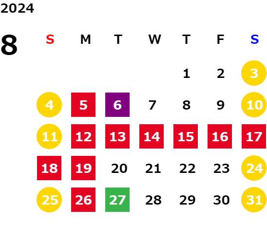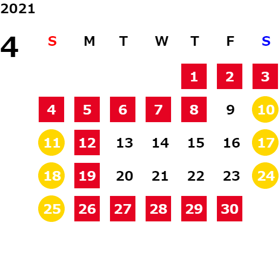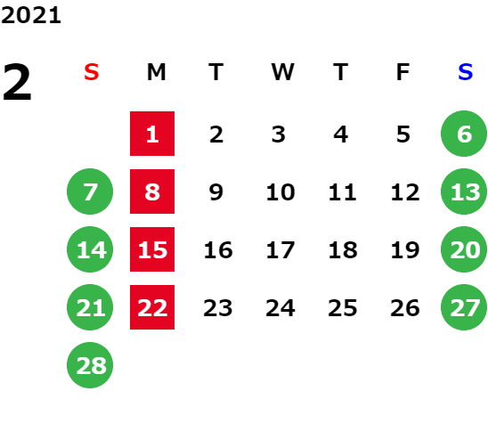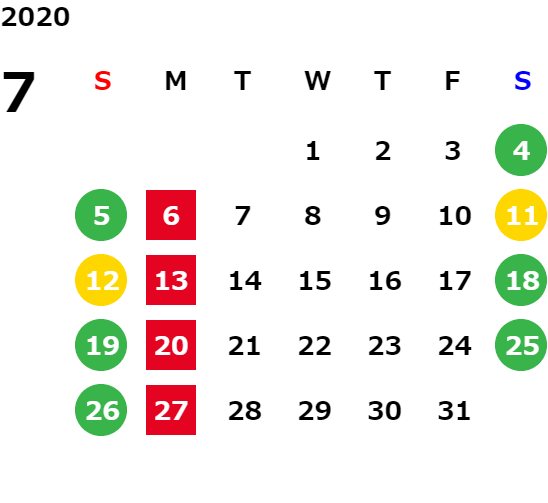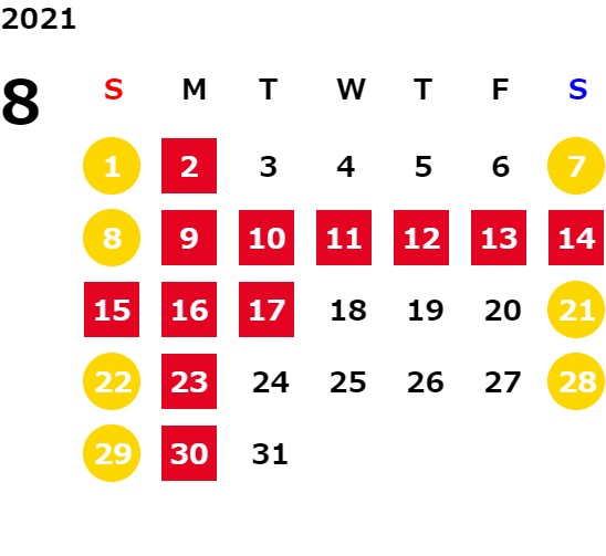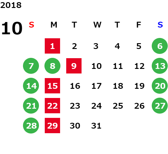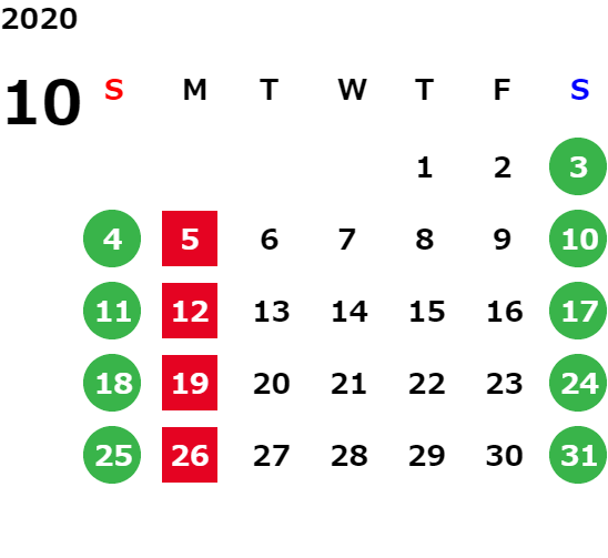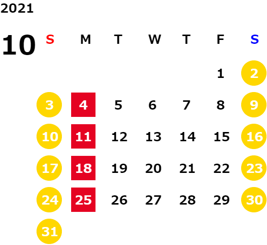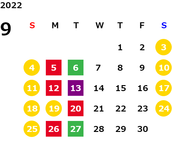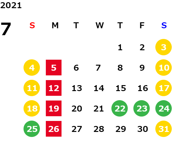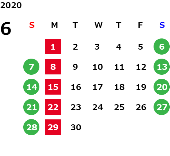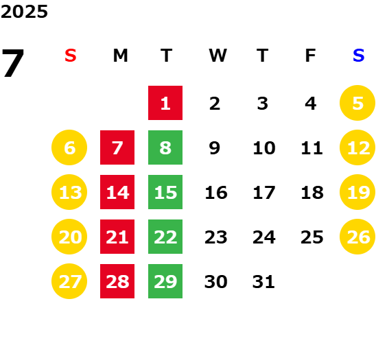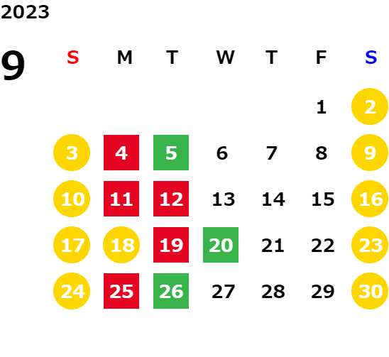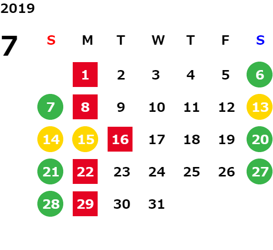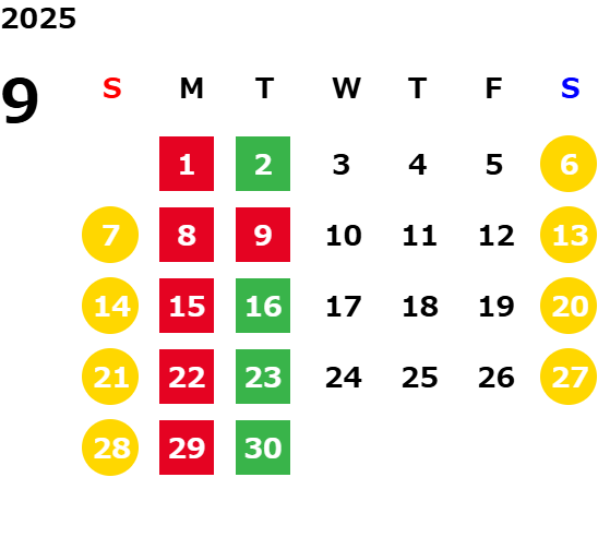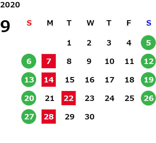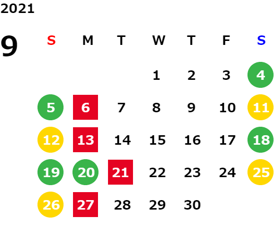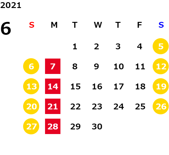 毎週月曜日及び第1火曜日(月曜日が祝日の場合は翌平日、ただし7/21、9/15、10/13は祝日定休)